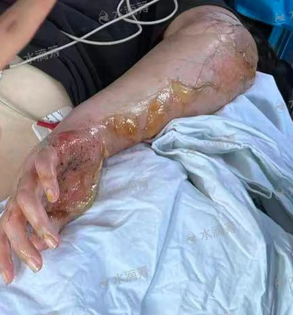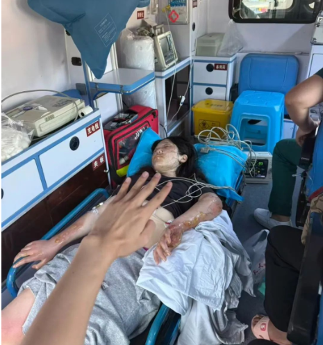 随之回头一看,躺在地上的熊英浑身布满大小水泡,胳膊、双脚、脖子和脸上全是伤痕,破烂的衣服粘在皮肤上,她疼得浑身发抖,连哭喊的力气都没有。