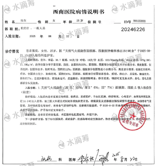 ▲诊断为:天然气火焰烧伤,浅 Ⅱ° 烧伤占 12%,深 Ⅱ° 烧伤占 6%,Ⅲ° 烧伤占 7%,面颈部、四肢多个位置受伤严重。
