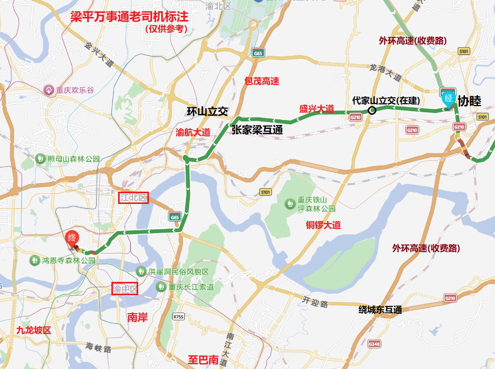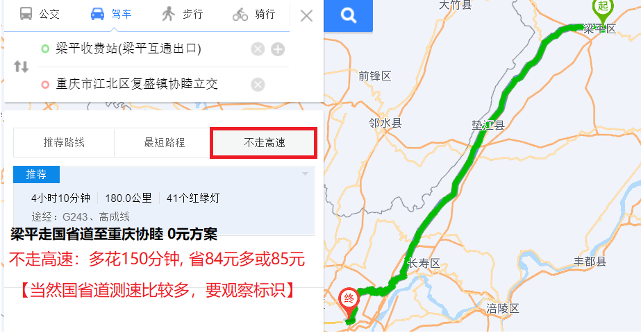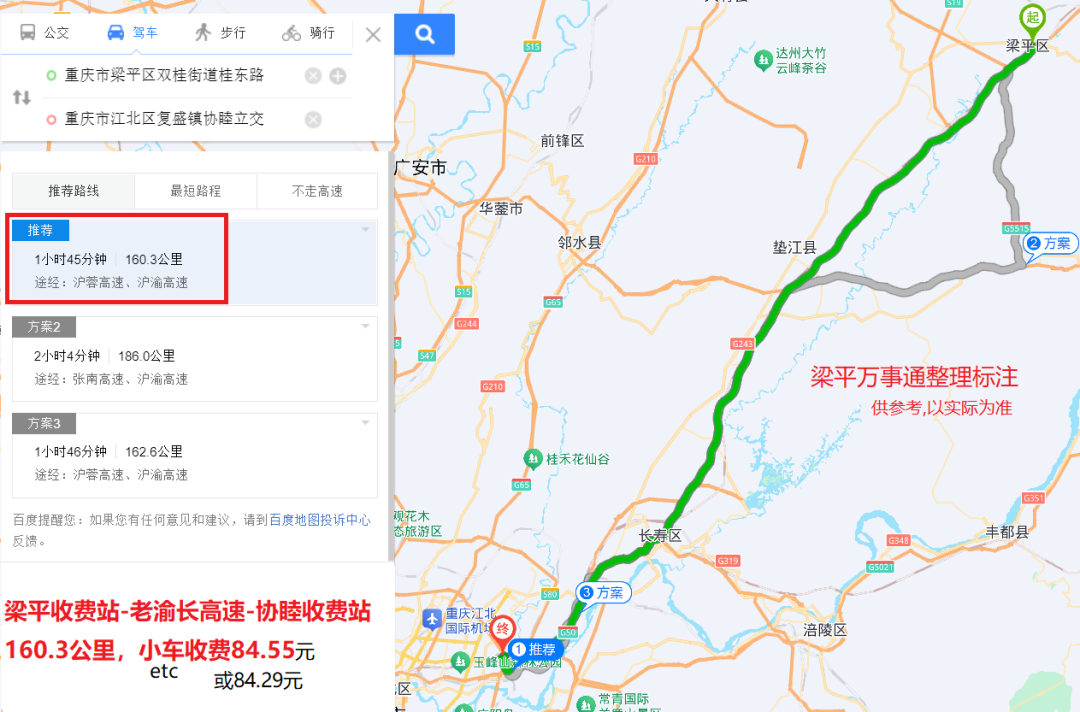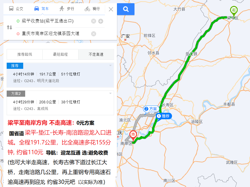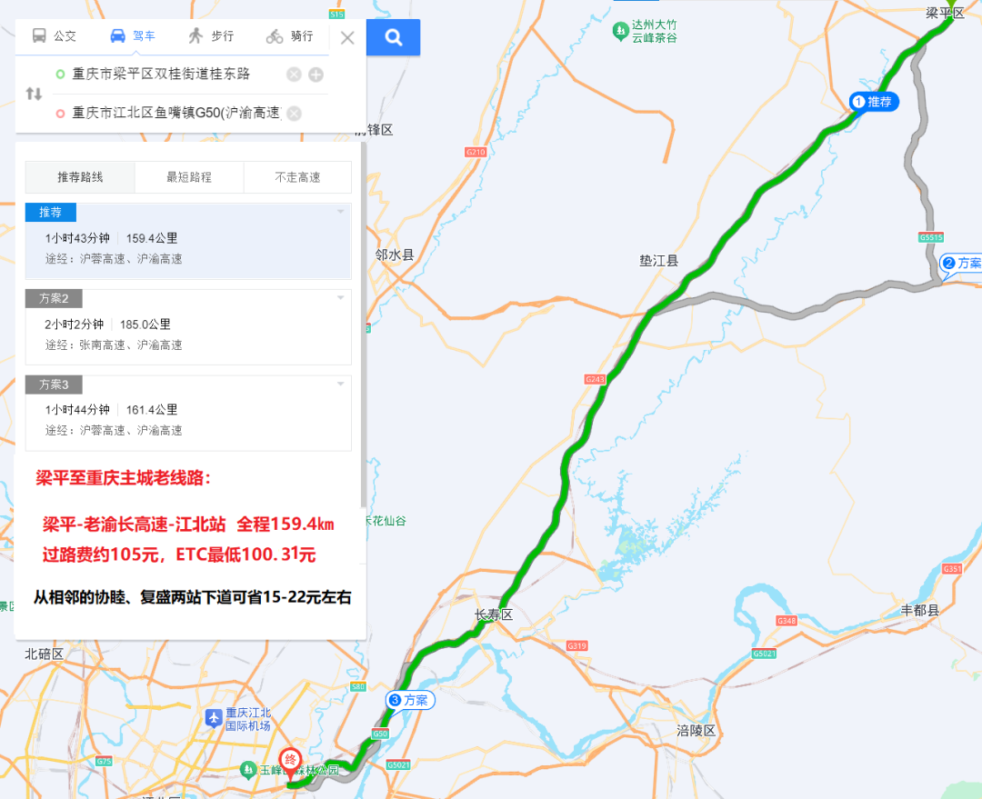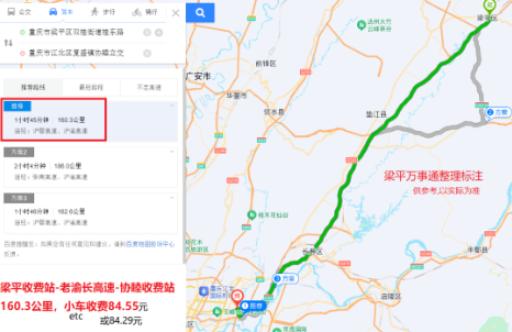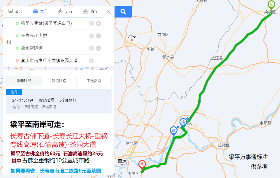 梁平-南岸 全价85元左右中途在长寿古佛下道,中途约10公里城市道路,过长寿长江大桥。点下图滑屏放大看