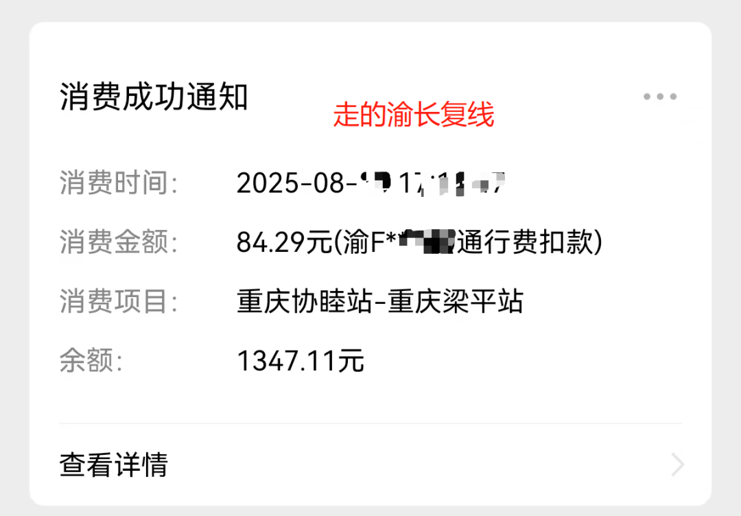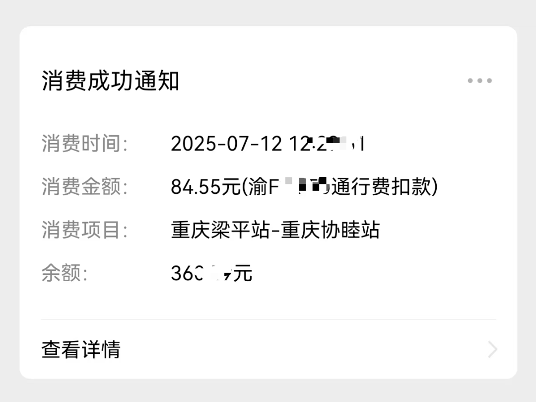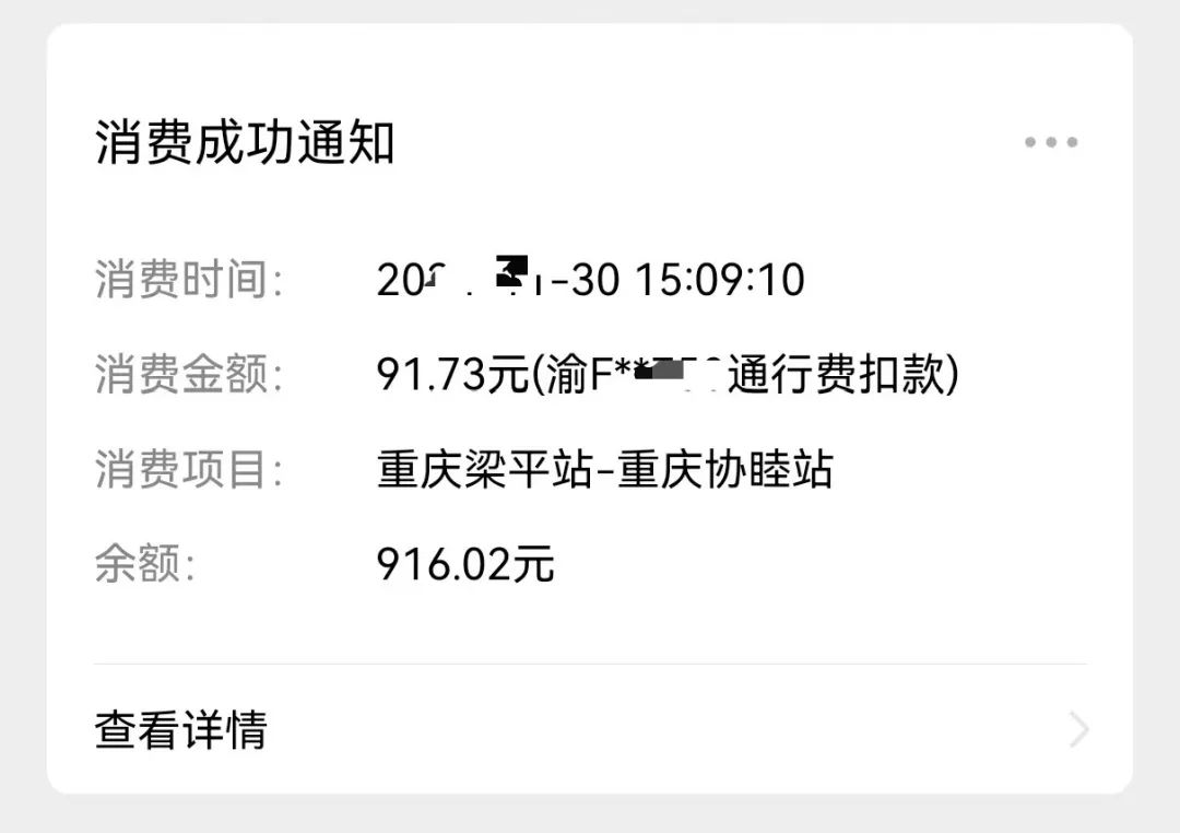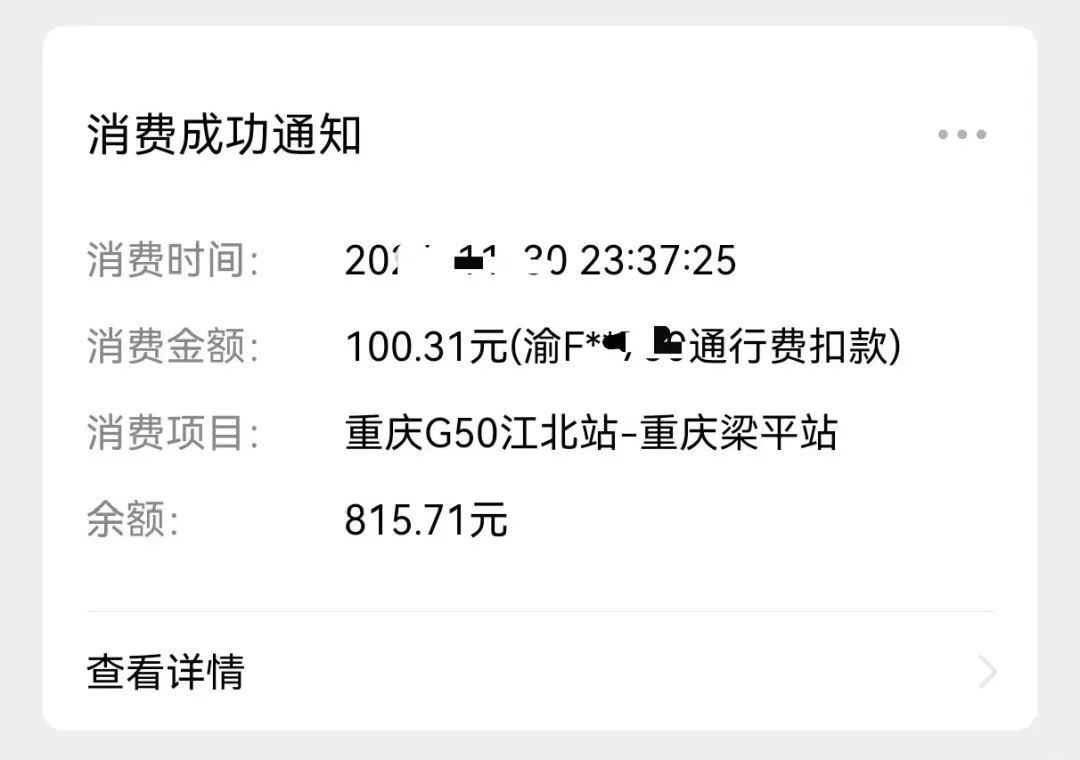 一般地,导航会自动推荐你走梁平-垫江-长寿-老渝长高速-江北收费站。而江北收费站是十几年前实施路桥费扩大范围时,从东环立交处搬迁约22公里,北移到现在的鱼嘴工业园处,所以从此下道,会默认你走完这22公里高速并买单的。扣费如下图 此线路也可走新的渝长复线高速,全价都大概是105元,有的ETC打折9.5折,有的ETC打折9.7折。万事通网友司机走复线高速,全程最低100.13元过路费。如果你进出城一直走的这条线路,感谢你为高速路发展所做贡献。