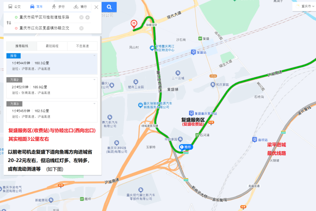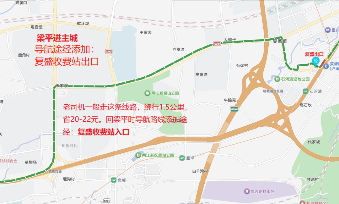 梁平-老渝长高速-复盛下道-鱼嘴立交-进城绕行1.5公里,省20-22元,但红绿灯多、左转多,或有流动测速(多人吃过罚单)