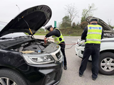 梁平西收费站前车趴窝,警车搭电为司机解困