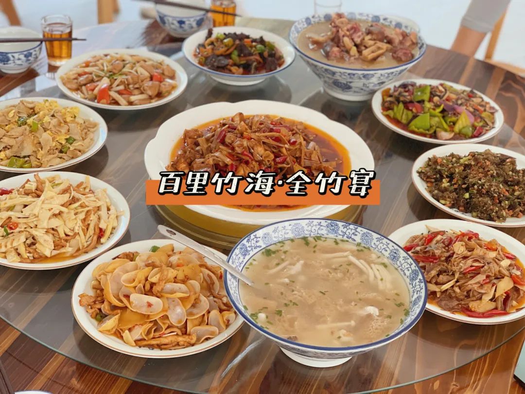推荐耍事:可前往百里竹海星空露营基地观看拾光音乐会,连续7天(9月30日-10月6日晚19:30-21:00)。现场乐队LIVE、火锅烤肉、啤酒露营、文艺特色民宿。特色菜为全竹宴,竹荪、竹荪蛋、竹虫、竹胎盘、竹燕窝等竹林纯天然生长的野生山珍,精心烹饪成“全竹菜系”;猎神茶餐厅(猎神三巷)订餐联系023-53689991、18913670366,寿海竹楼(寿海景区)13509432476、023-53369688荔枝古道等4条经典徒步环线——难度不同可选择合适路线组团挑战。墨林竹院、梦溪湉园、星空房车露营基地、梁山驿、猎神茶餐厅等100余家民宿竹家乐