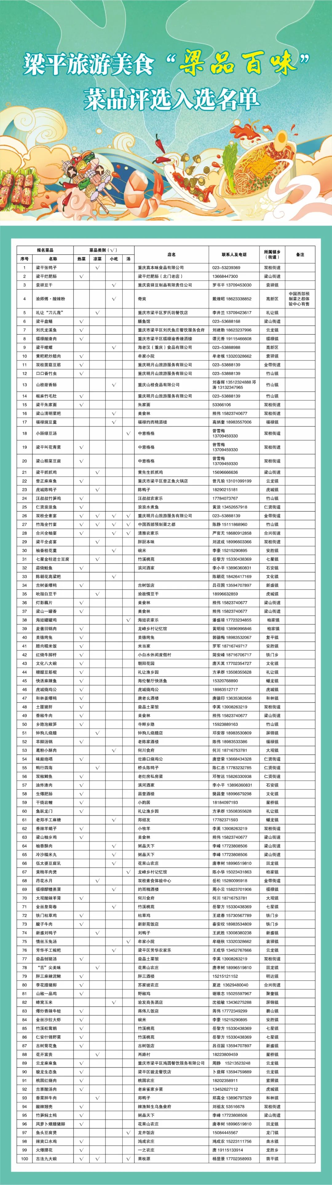 除了以上乡镇美景、美食,梁平还有8处成功入榜重庆美食“渝味360碗”2024年体验店、示范店、旗舰店、美食街区评选名单。分别为:双桂素食体验中心、梁平烂肥肠、刘氏龙溪鱼、鳝鱼馆、中意格格秘厨府、张鸭子(市外)入选体验店;美食林大饭店入选示范店;百年张鸭子酒楼入选旗舰店。以及梁平的这份【梁品百味】清单,吃啥喝啥的完整攻略早就给大家备好啦~点击大图查看哦
