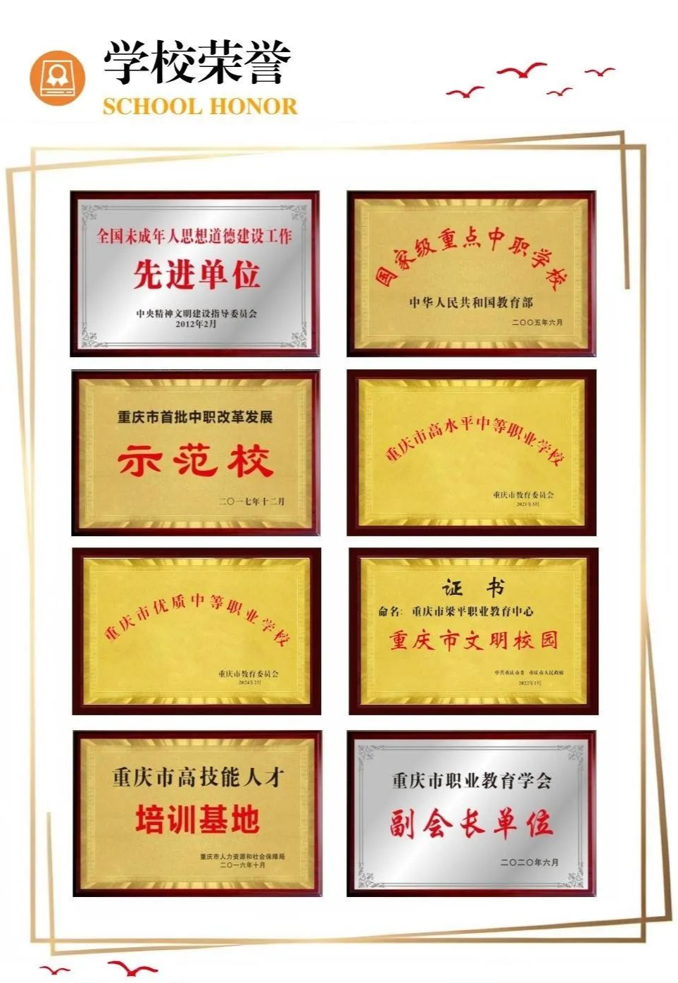 重庆市梁平职业教育中心是梁平区唯一一所公办全日制中等职业学校,是国家级重点中职学校、重庆市首批中职改革发展示范校、重庆市高水平中等职业学校、重庆市双优中等职业学校,是中央文明委命名的全国未成年人思想道德建设先进单位,是重庆市委、市政府命名的重庆市文明校园。