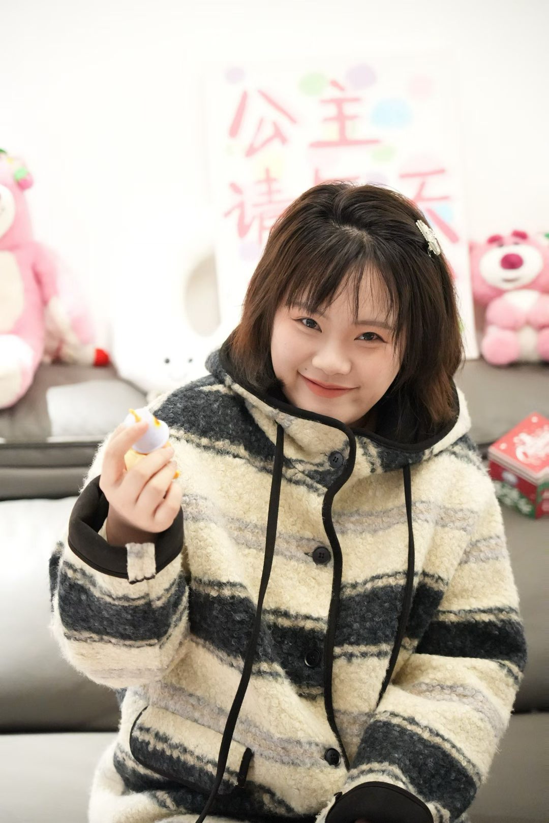 后来又翻出两个小玩偶让我举着,我故意做出夸张的表情,她在旁边笑到拍虚了好几张。背景里的草莓熊玩偶歪歪扭扭的,墙上“公主请开心”的字牌也歪着,乱糟糟的却特别有幸福感。