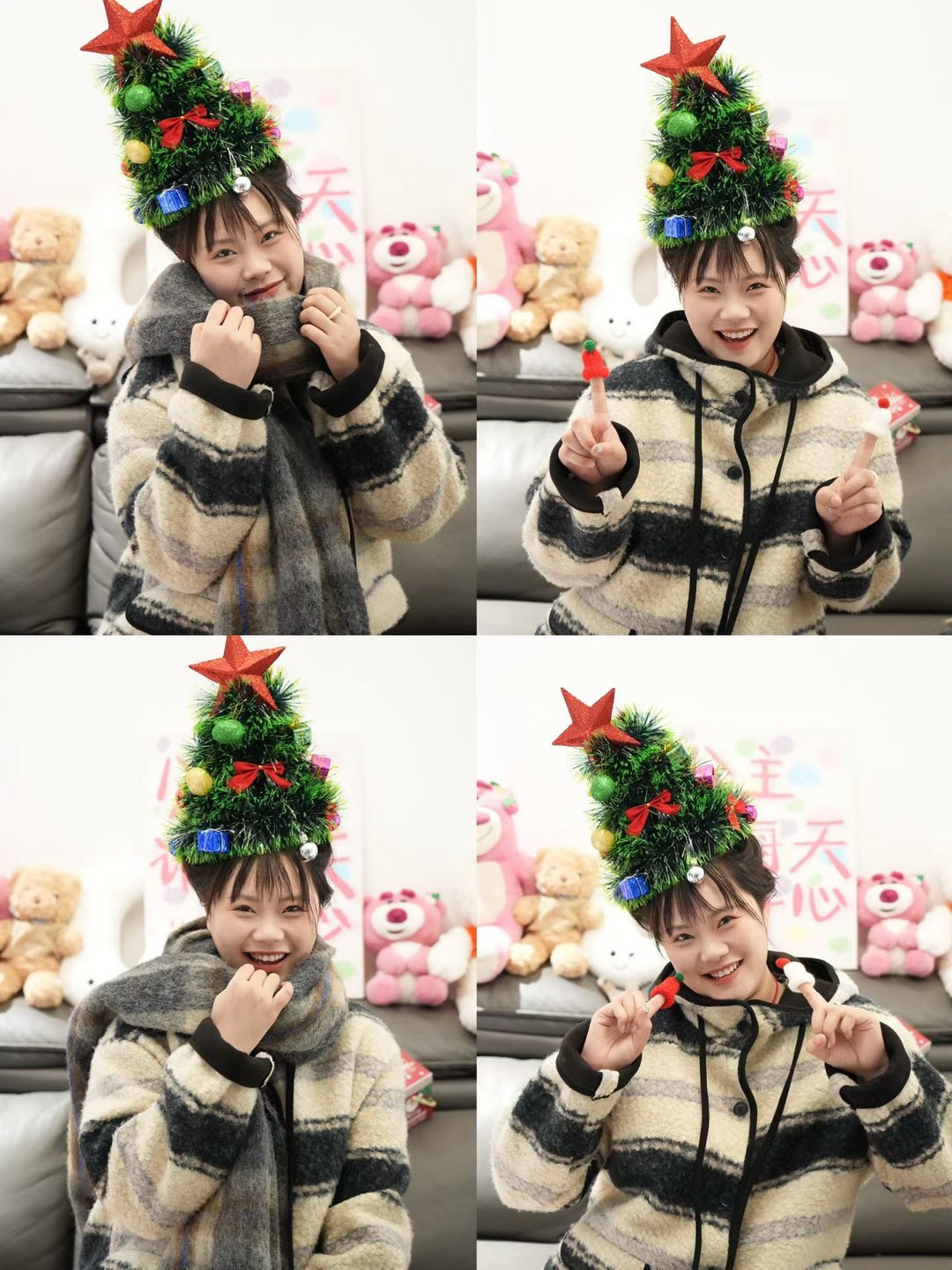 一早她就抱着一堆小道具冲过来,圣诞树发箍往我头上一扣,还非要给我围上厚围巾,说这样才有圣诞氛围。我被她折腾得哭笑不得,对着镜头比耶的时候,手都不知道往哪放,结果她抓拍的几张反而怪可爱的。