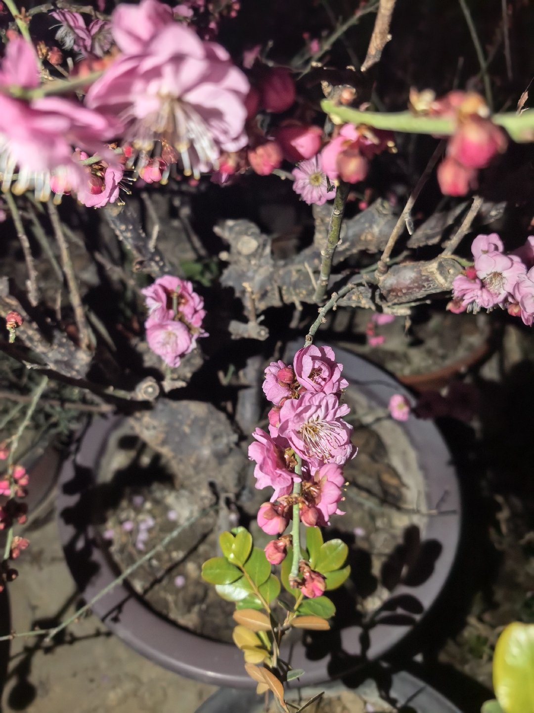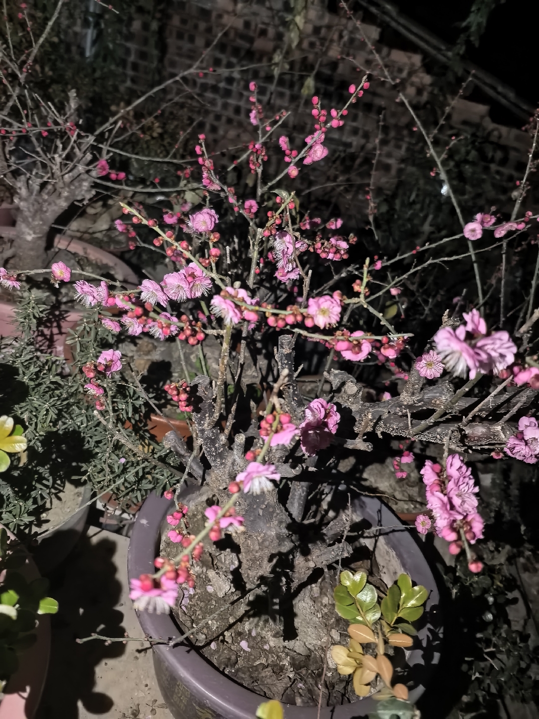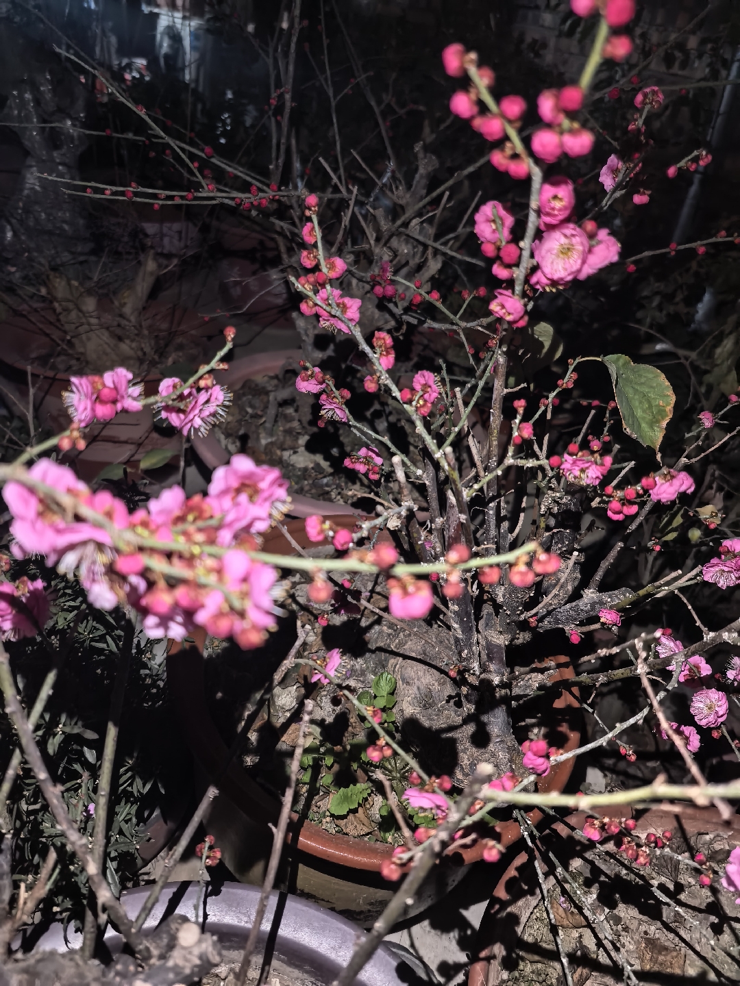 很久没到顶楼上看看了,今晚去顶楼找东西,闻到一股梅花的清香,打开手机电筒一看,梅花居然都开了,而且在灯光的照射下,夜晚的梅花比白天更妖艳!读书少,文化低,无法用语言来表达她的美,随手拍两张照片跟大家分享一下!