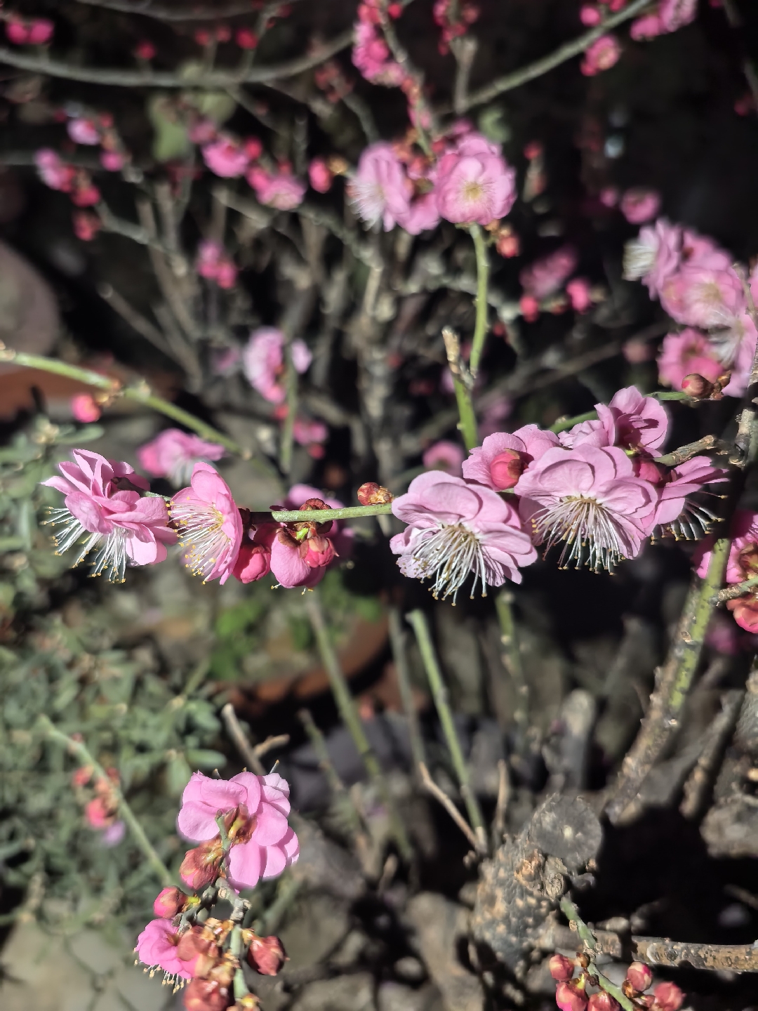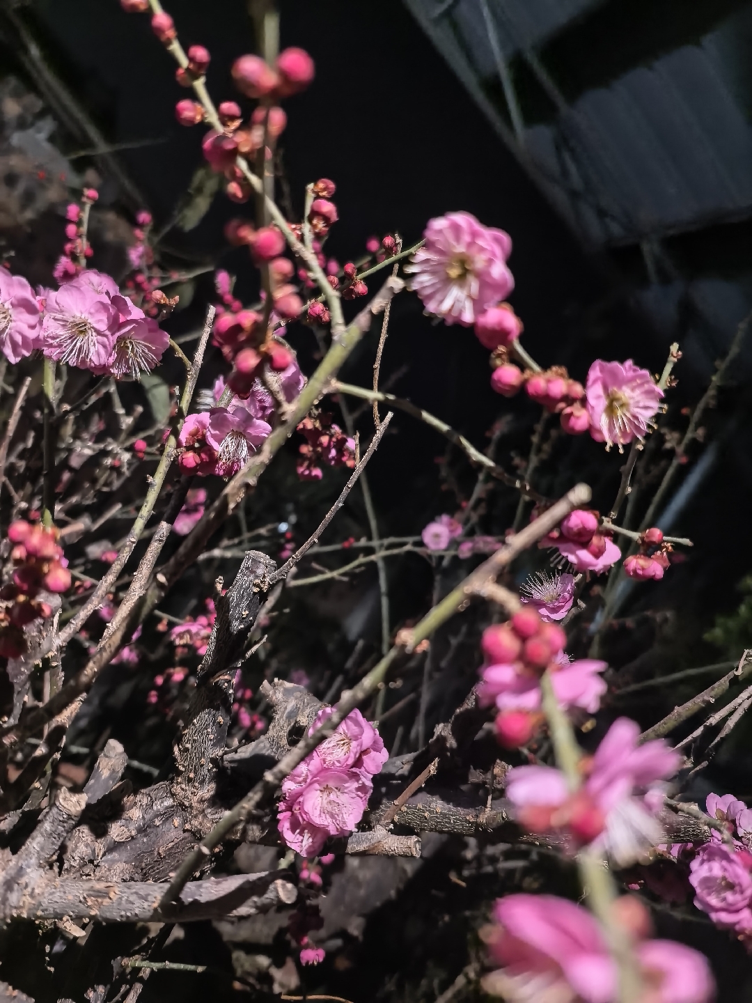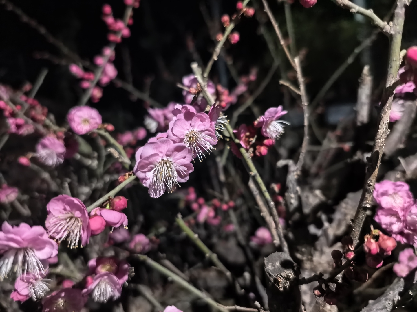 很久没到顶楼上看看了,今晚去顶楼找东西,闻到一股梅花的清香,打开手机电筒一看,梅花居然都开了,而且在灯光的照射下,夜晚的梅花比白天更妖艳!读书少,文化低,无法用语言来表达她的美,随手拍两张照片跟大家分享一下!