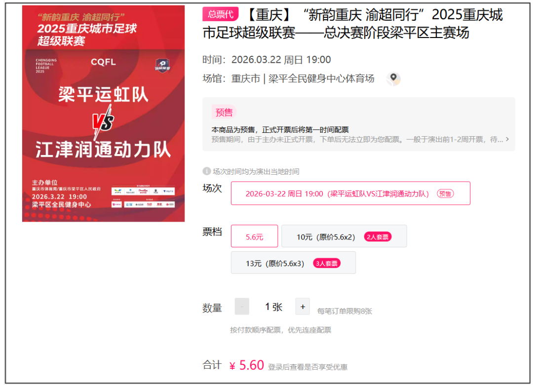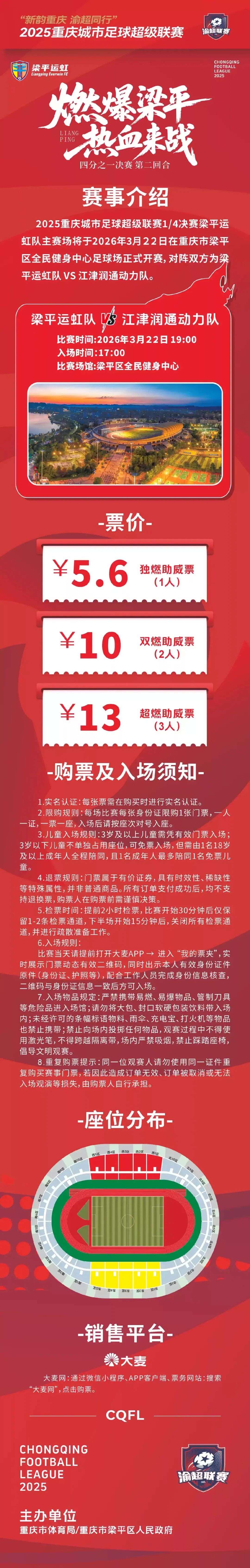 5.6元开抢! 3月22日梁平主场购票通道已开启