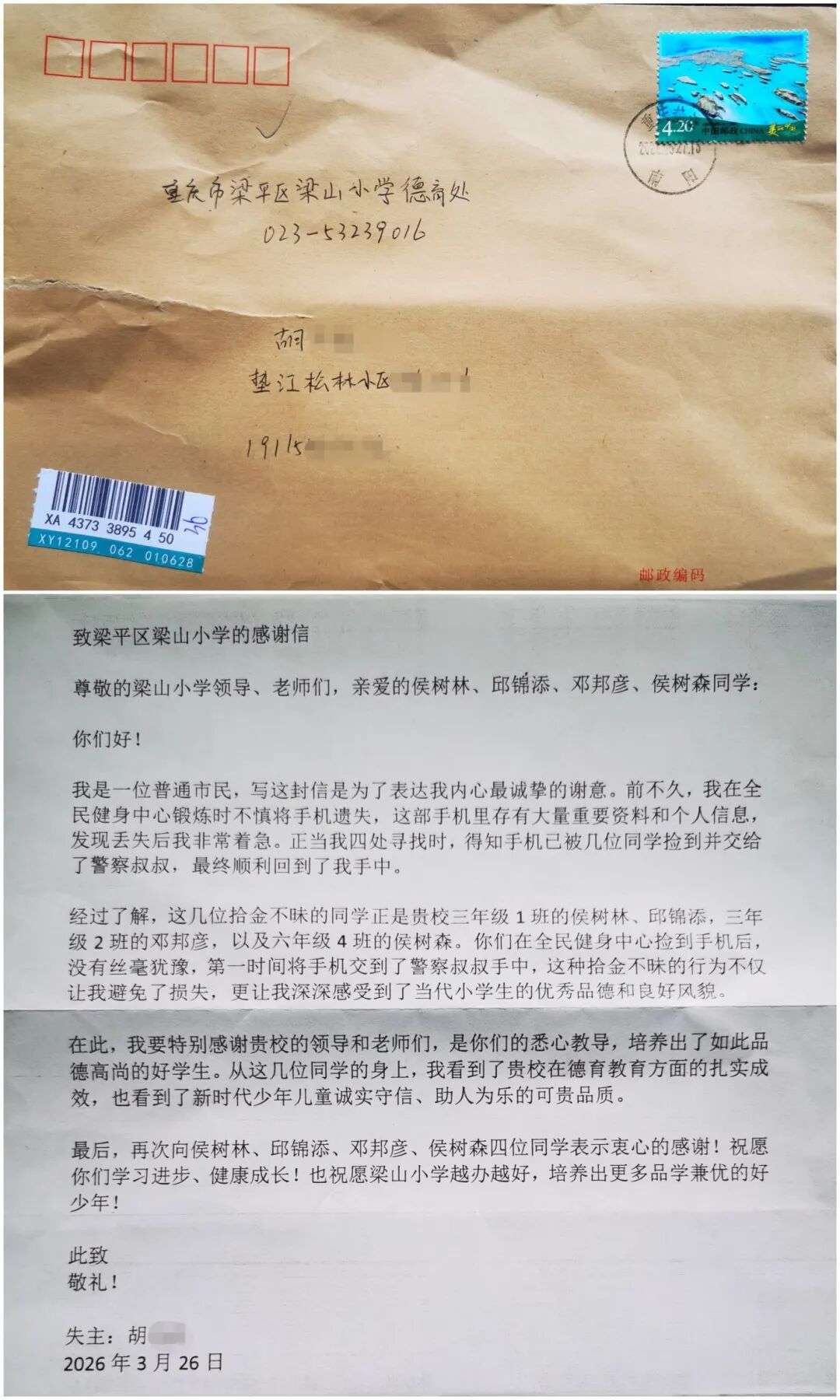 梁平梁山小学收到垫江网友一封信,就因为这4位小学生……