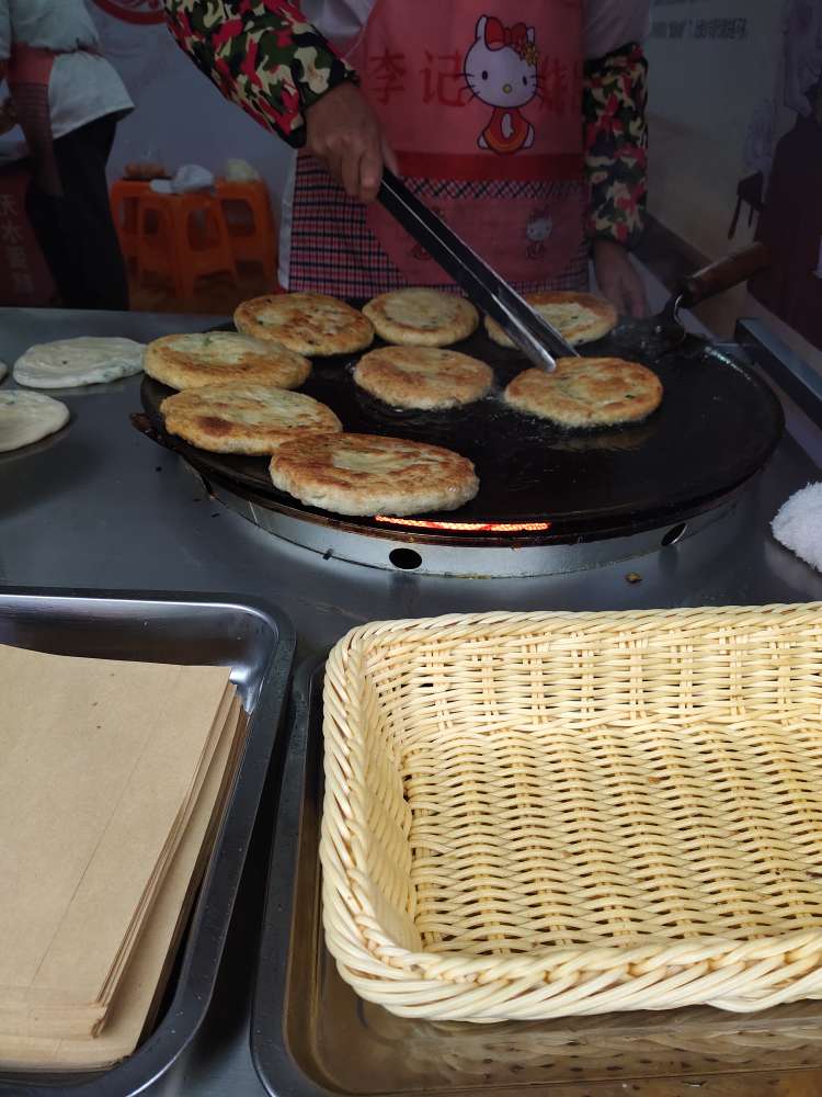 西池广场这家烙馅饼卖的老板,说他做的是烧饼。那你们看看,这是不是烧饼嘛?!