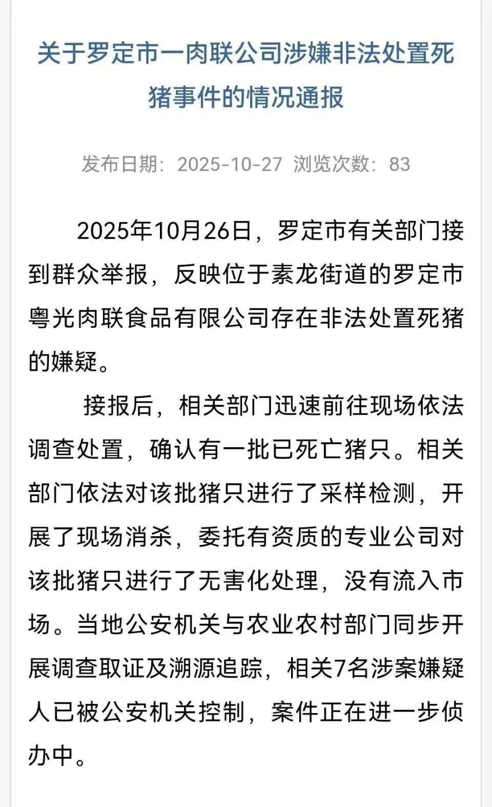 广东罗定一肉联食品公司堆放大量死猪,当地通报:7人被公安机关..